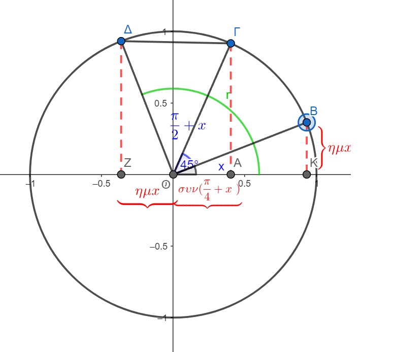 Στο παραπάνω link δίνεται εφαρμογή σε geogebra που σχετίζεται με την παρουσίαση “Επίλυση εξισώσεων με εναλλακτικούς τρόπους” https://ptsampouka.sites.sch.gr/index.html Η εφαρμογή υλοποιεί σχηματικά την επίλυση της τριγωνομετρικής εξίσωσης συν(θ+x)+ημx=α. Ο χρήστης μπορεί να πειραματιστεί μετακινώντας το σημείο Β που βρίσκεται πάνω στον τριγωνομετρικό κύκλο ώστε να επαληθεύσει την τιμή του x που προσδιόρισε θεωρητικά και αποτελεί τη λύση της εξίσωσης για τη μέγιστη τιμή του α που επιτρέπει την ύπαρξη λύσεων στην εξίσωση. Μπορεί επίσης να χρησιμοποιήσει την εφαρμογή ώστε πειραματικά να προσδιορίσει τις λύσεις της για τιμές του α μικρότερες από την επιτρεπτή.